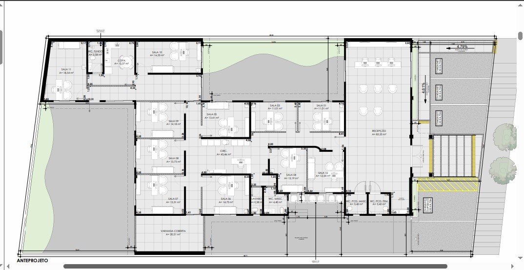 Recepção, Possui 5 banheiros, 11 salas.